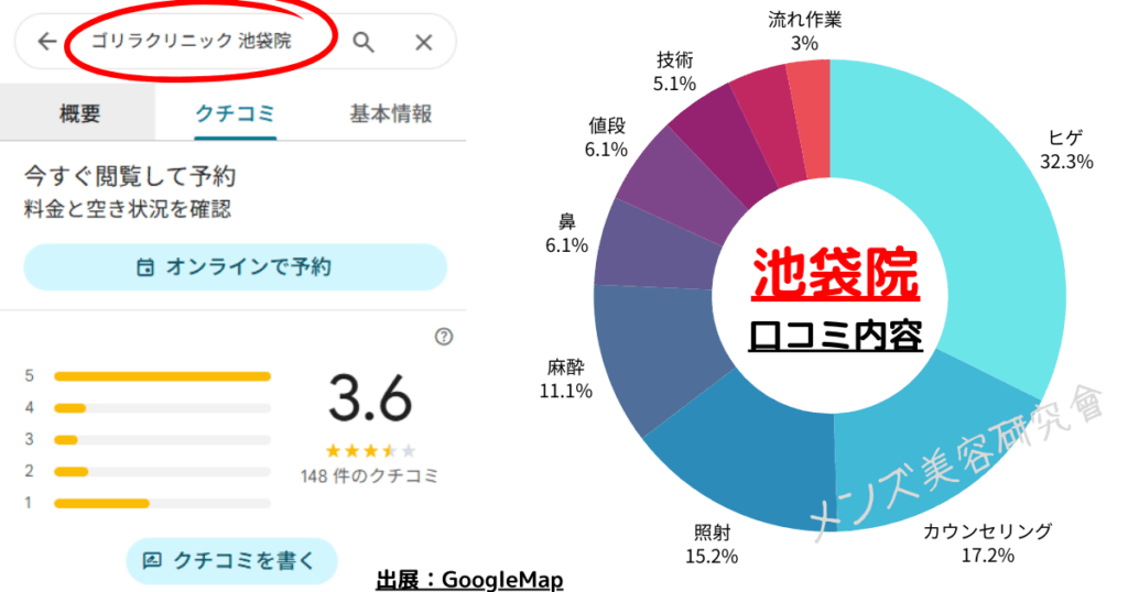 実際のGoogleの口コミを参考に、今もっとも話題に登る男性専用の医療脱毛クリニックであるゴリラクリニック池袋院を選ぶ参考になれば幸いです。
