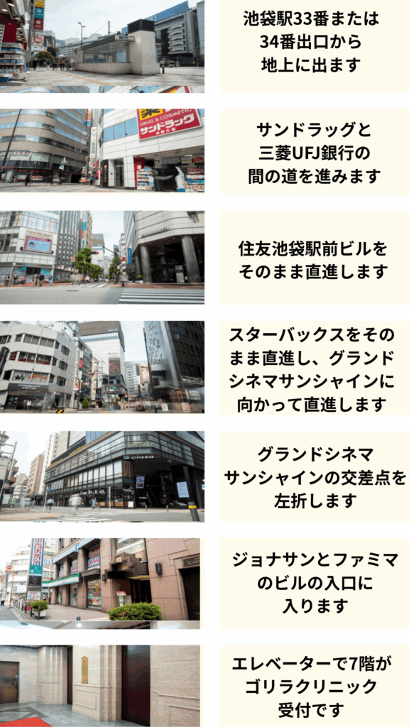 ここでは【ゴリラクリニック池袋院】の所在地、アクセス方法、営業時間など、基本情報をご紹介します。