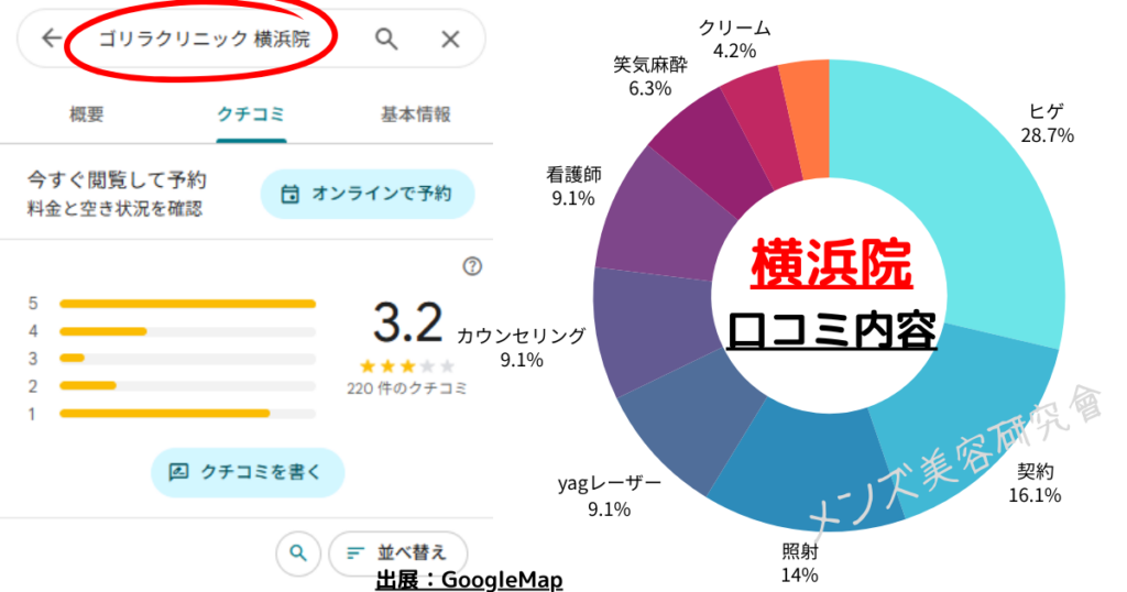 実際のGoogleの口コミを参考に、今もっとも話題に登る男性専用の医療脱毛クリニックであるゴリラクリニック横浜院を選ぶ参考になれば幸いです。