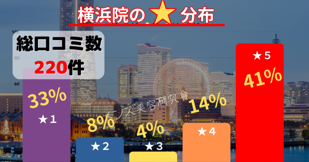 横浜院のGoogle口コミ平均は★3.2でした。★3~5を合計して約6割が高評価しています。